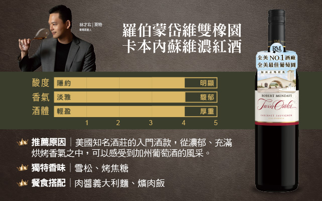 • 羅伯蒙岱維雙橡園卡本內蘇維濃紅酒